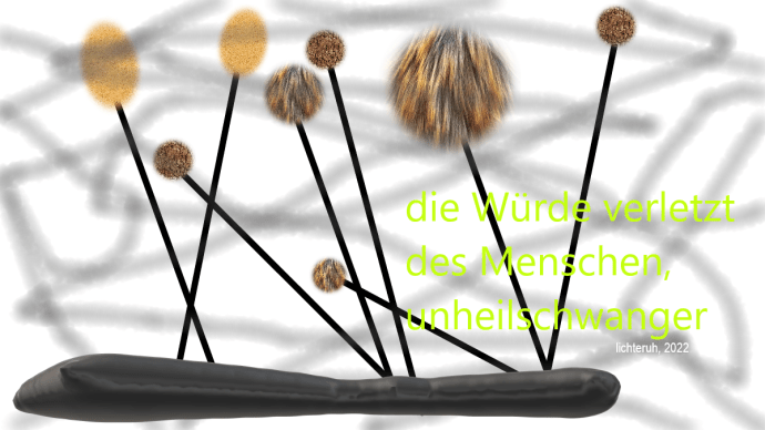 Gefühlsausbreitung,alles ist auf einmal wie Weihnachten,an meinem Tischdie Stimmung ist ernst,ich dichte. Machen wir den Sieg, Deutschland,es kommt aus seiner Scheiße raus?Holocaust. Ich denke, nie, nie wieder,das hängt ihm ewig an,diese Lieder,was damals geschah. Heil, …